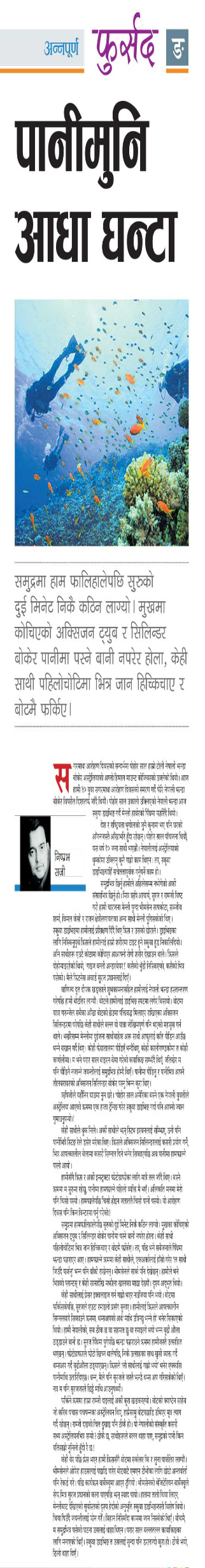 केही साथीहरुले थुक निले । अर्को साथीले झन् स्टिभ इरवन लाई सम्झिए, उनी पनि पानी भित्रै स्टीङ रे ले डसेर मरेका थिए । क्रिसले अक्सिजन सिलीण्डर लाई कसरी प्रयोग गर्ने । भित्र आपतकालील बेलामा कसरी सिग्नल दिने भनेर सिकाए पछि, अब पानीमा हाम फाल्ने पालो आयो । हामी सँगै क्रिस र अर्को इन्सट्रक्टर फोटोग्राफीको लागि मात्रै तल जाँदै थिए । बस्ने क्रममा म शुरुमा रहेछु, पानीमा हाम फाल्ने पहिलो ब्यक्ति मै भएँ । अलिकति मनमा मेरो पनि चिसो पस्यो । हामफाले पछि चिसो होइन जताततै चिसो पानी पस्यो । यो आरोहण दिवस पनि किन विन्टरमा पर्नुपरेको हो । हाम फाली हालेपछि शुरुको दुइमिनेट निकै कठीन लाग्यो । मुखका कोचिएको अक्सिजन ट्युब र सिलिन्डर बोकेर पानीमा पस्ने बानी नपरेर होला । केहीसाथीहरुले पहिलो चोटीमा भित्र जान हिच्किचाए र बोटमै फर्किए तर पछि भने सबैजनाले पिँधमा झण्डा फहराएर आए । हामफाल्ने क्रममा केही साथीहरुले, एक अर्कालाई हाँसो गरेर— ल साथी जिउँदै फर्कनुस्— भन्न पनि बाँकि राखेनन् । भिमसेन जी ले सार्क पनि देखेछन् । हामीले भने भित्रको प्लान्टस् र केही साना देखि मझौला खालका माछाहरु देख्यौँ । दृश्य अद्भुत थियो । जिन्दगीमा सबैले लिनु पर्ने अनुभव ।