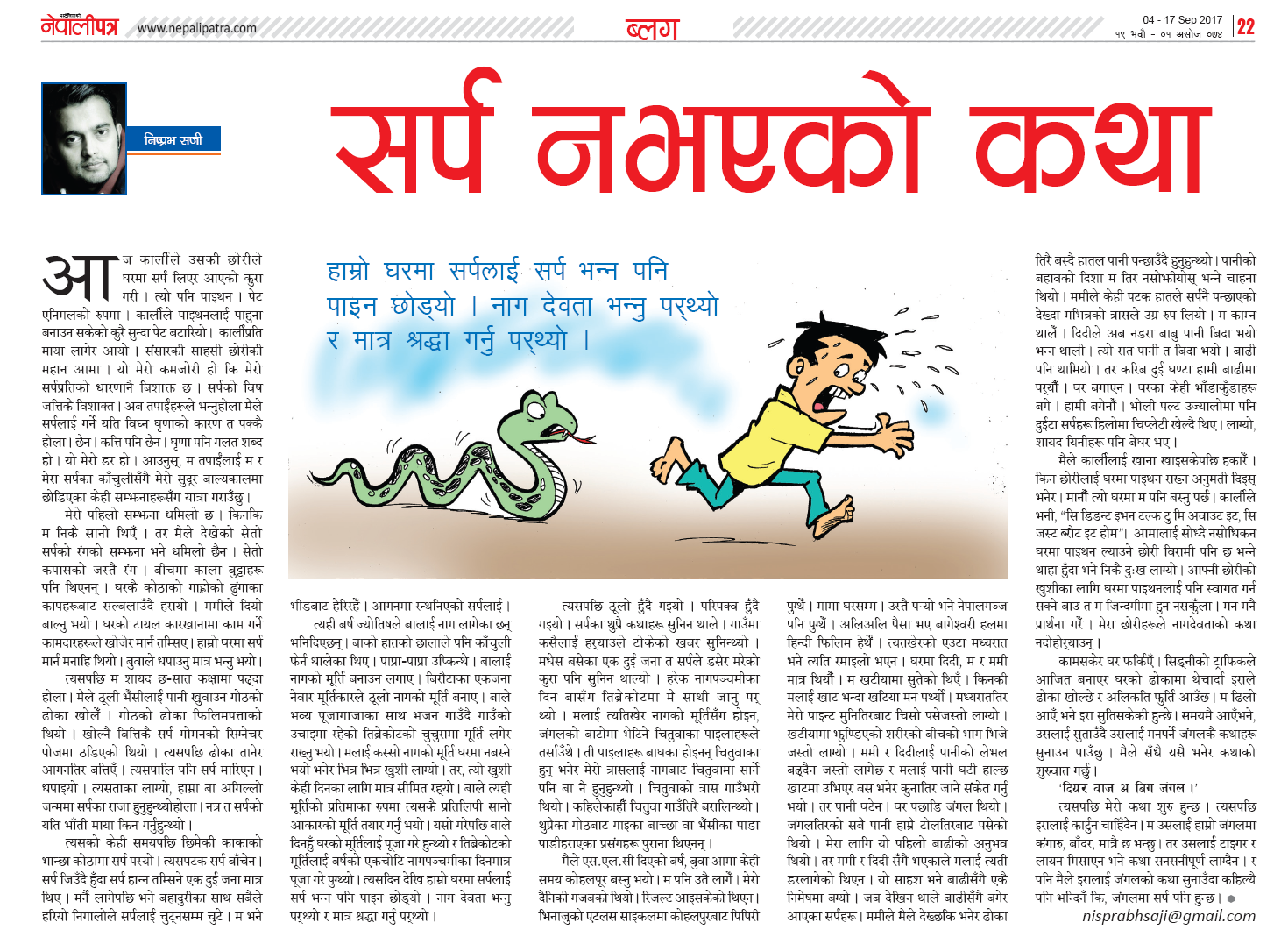 त्यसपछि म शायद छ–सात कक्षामा पढ्दा होला । मैले ठूली भैँसीलाई पानी खुवाउन गोठको ढोका खोलेँ । गोठको ढोका फिलिमपत्ताको थियो । खोल्नै बित्तिकै सर्प गोमनको सिग्नेचर पोजमा ठडिएको थियो । त्यसपछि ढोका तानेर आगन तिर बत्तिएँ । त्यसपाली पनि सर्प मारिएन । धपाइयो । त्यस ताका लाग्यो, हाम्रा बा अगिल्लो जन्ममा सर्पका राजा हुनुहुन्थ्यो होला । नत्र त सर्पको यति भाँती माया किन गर्नुहुन्थ्यो ।