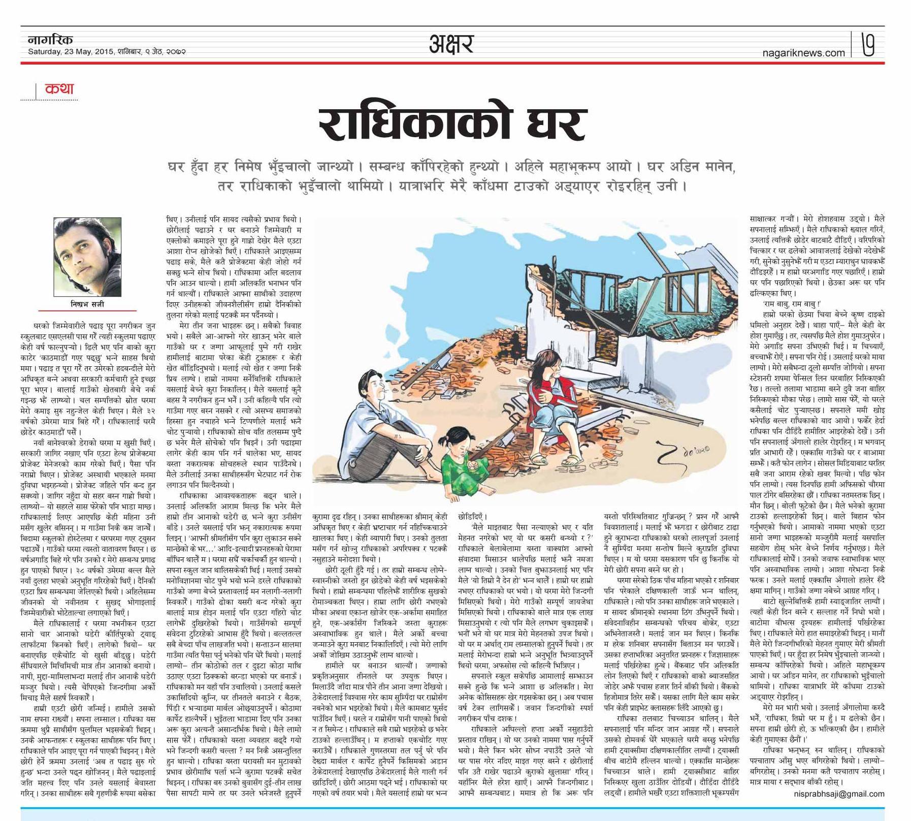हामीले घर बनाउन थाल्यौँ । जग्गाको प्रकृति अनुसार तीन तले घर उपयुक्त थिएन । मिलाउँदै जाँदा मात्र पौने तीन आना जग्गा देखियो । ठेगदारलाई बिश्वास गरेर काम सुम्पिँदा घर राम्रोसँग नबनेको भान भइरहेको थियो । मैले कामबाट फुर्सद पाउँदिन थिएँ । घरले न राम्रोसँग पानी पाएको थियो न त सिमेन्ट । राधिकाले सबै राम्रो भइरहेको छ भनेर टाउको हल्लाउँथिन् । म हप्ताको एकचोटि गएर कराउँथेँ । राधिकाले गुणस्तरमा तल पर्नु परे पनि देख्दा मार्वल र कार्पेट हुनै पर्ने किसिमको अडान ठेकदारलाई दखाएपछि ठेकदारलाई मैले गाली गर्न छाडिदिएँ । छोरी आठमा पढ्ने भइ । राधिकाको घर गएको बर्ष तयार भयो । मैले यसलाई हाम्रो घर भन्न छोडिदिएँ ।